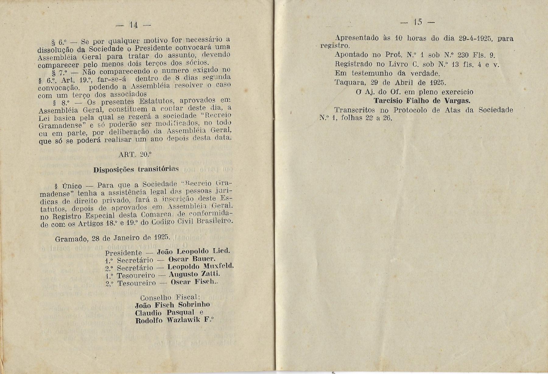 Páginas 14 e 15 Estatutos Sociedade Recreio Gramadense 1944. Acervo S.R.G.